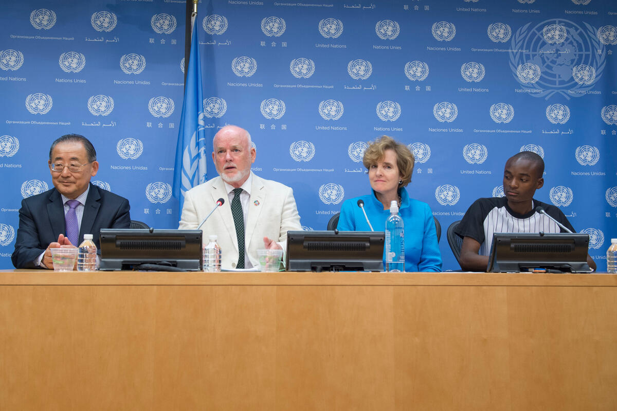 Peter Thomson (centre left), President of the seventy-first session of the General Assembly, briefs journalists on the Assembly’s High-level Action Event on Sustainable Development Goal 4: Education. Also addressing reporters with him were (from left): Qian Tang, Assistant-Director General for Education at the UN Educational, Scientific and Cultural Organization (UNESCO); Alice Albright, Chief Executive Officer of the Global Partnership for Education; Saul Mwame, seventeen-year-old student from Tanzania.