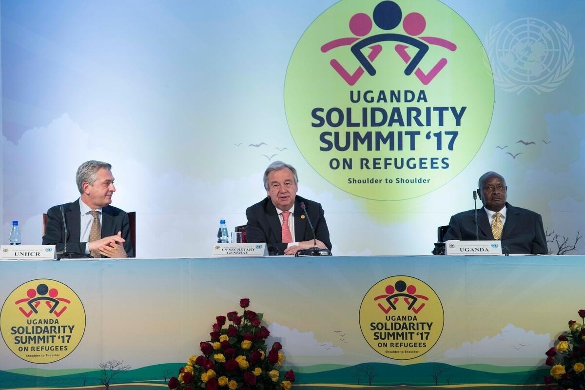 Secretary-General António Guterres (centre) co-chairs the Summit with Yoweri Kaguta Museveni (right), President of the Republic of Uganda. Also pictured, Filippo Grandi, UN High Commissioner for Refugees.