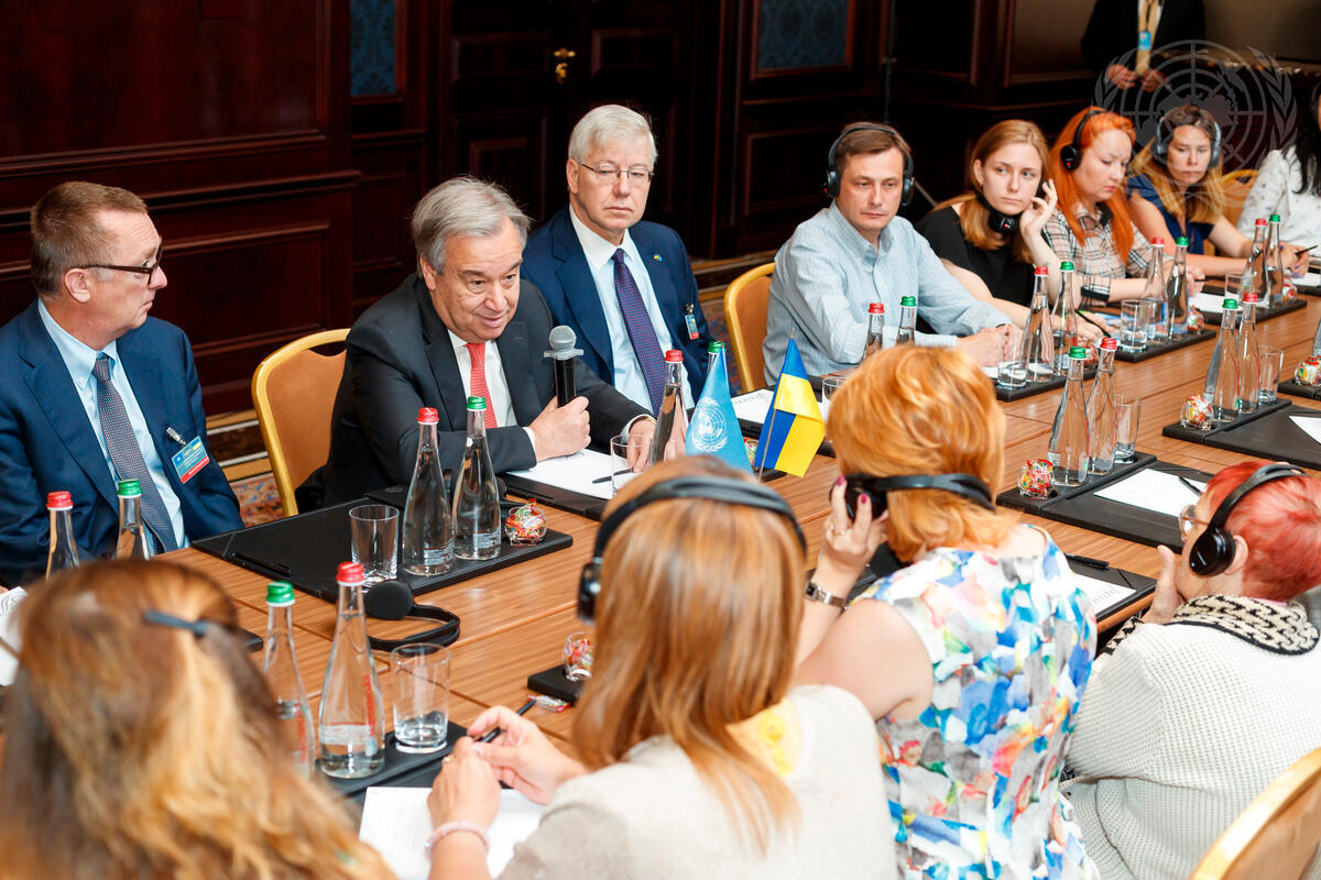Secretary-General António Guterres (second from left) meets with internally displaced people from Crimea and the east of Ukraine, during his visit to Kyiv. At left is Jeffrey Feltman, Under-Secretary-General for Political Affairs.