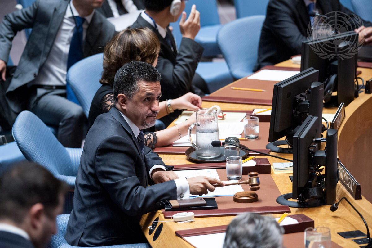 Sacha Sergio Llorentty Solíz, Permanent Representative of the Plurinational State of Bolivia to the UN and President of the Security Council for June, chairs the Council's meeting on the situation in Syria.