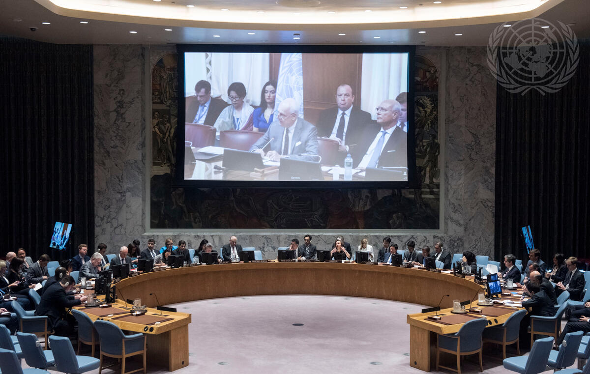 Staffan de Mistura (on screen), UN Special Envoy for Syria, briefs the Security Council via video conference.