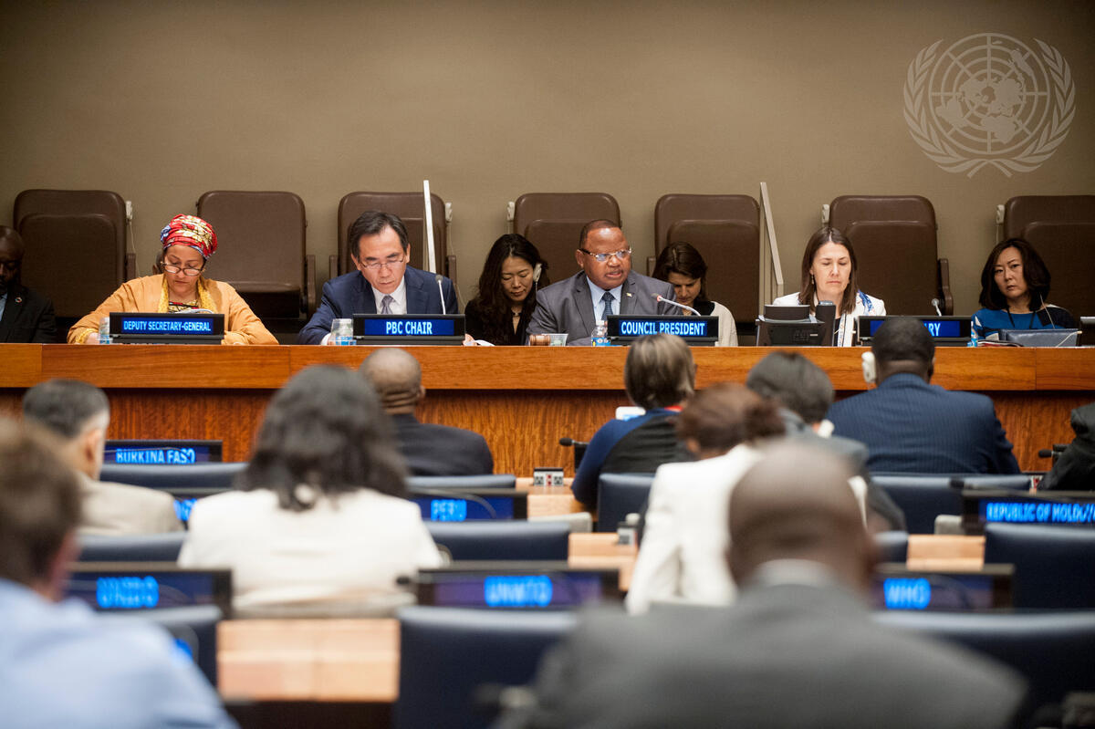 Frederick Musiiwa Makamure Shava (centre), Permanent Representative of the Republic of Zimbabwe to the UN and President ECOSOC, addresses the meeting. Also pictured (from left): Deputy Secretary-General Amina Mohammed; Cho Tae-yul, Permanent Representative of the Republic of Korea to the UN and Chair of the PBC.