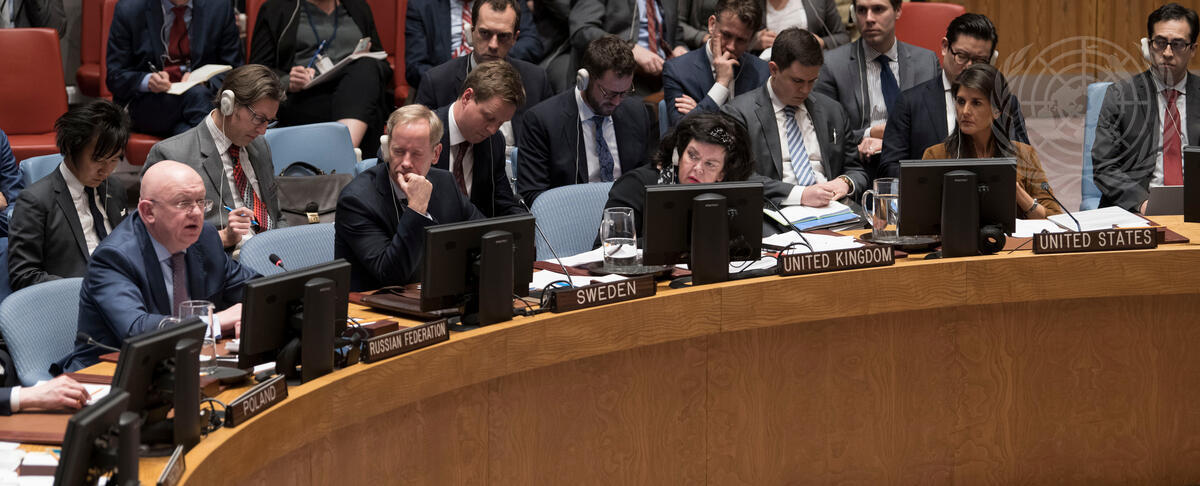 Vassily Nebenzia, Permanent Representative of the Russian Federation to the UN, exercises his right to reply during the emergency Security Council meeting on the situation in the Middle East, following reports of a chemical weapons attack in Syria.