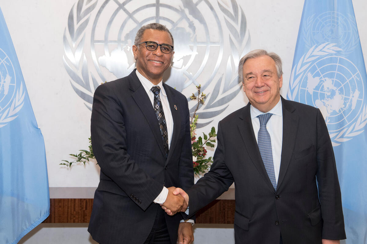 Secretary-General António Guterres (right) swears in Elliott Carlton Harris, Assistant Secretary-General for Economic Development and Chief Economist for the Department of Economic and Social Affairs (DESA).