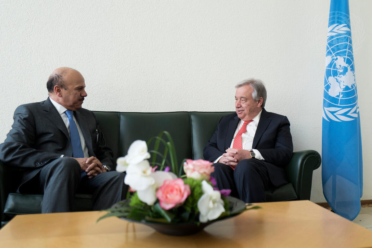 Secretary-General António Guterres (right) meets with Abdullatif bin Rashid Al Zayani, Secretary General of the Cooperation Council for the Arab States of the Gulf, during the High-level Pledging Event in Geneva for the Humanitarian Crisis in Yemen.