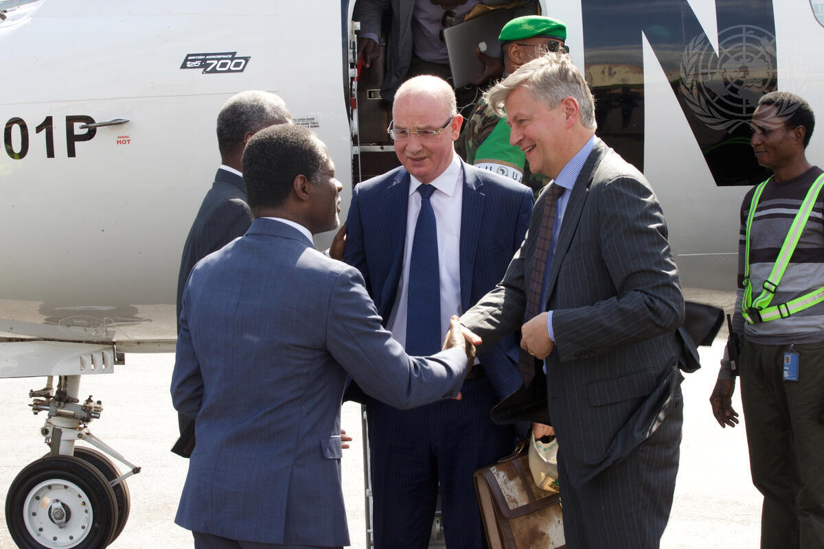 Parfait Onanga-Anyanga (front left), Special Representative of the Secretary-General and Head of the UN Multidimensional Integrated Stabilization Mission in the Central African Republic (MINUSCA), greets Jean-Pierre Lacroix (right), Under-Secretary-General for Peacekeeping Operations, as he arrives on a joint visit with Smaïl Chergui (second from right), African Union Commissioner for Peace and Security.