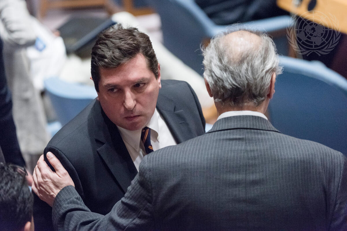 Vladimir K. Safronkov (left), Deputy Permanent Representative of the Russian Federation to the UN, with Bashar Ja’afari, Permanent Representative of the Syrian Arab Republic, in the Security Council Chamber after the conclusion of the meeting.