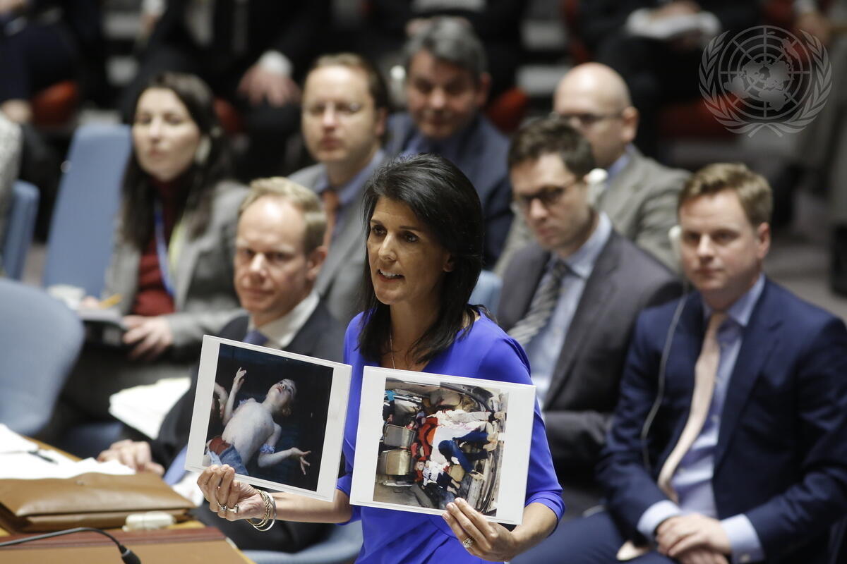 The Security Council met to discuss the alleged use of chemical weapons in an airstrike on 4 April in the Khan Shaykhun area of southern Idlib, Syria. Nikki Haley (centre), United States Permanent Representative to the UN and President of the Security Council for April, addresses the meeting.