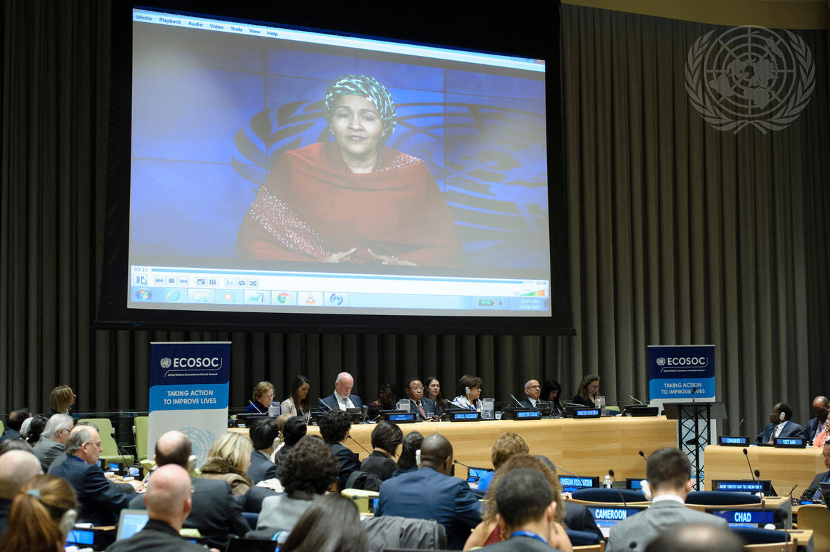 Deputy Secretary-General Amina Mohammed (shown on screen) adresses via video message the Partnership Forum of the Economic and Social Council (ECOSOC) 2017 session on the theme “Partnerships for promoting opportunities, increased prosperity and sustainable development for all”.
