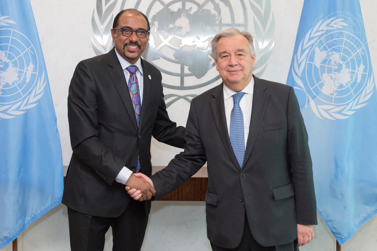 Secretary-General António Guterres (right) meets with Michel Sidibé, Executive Director of the Joint United Nations Programme on HIV and AIDS (UNAIDS).
