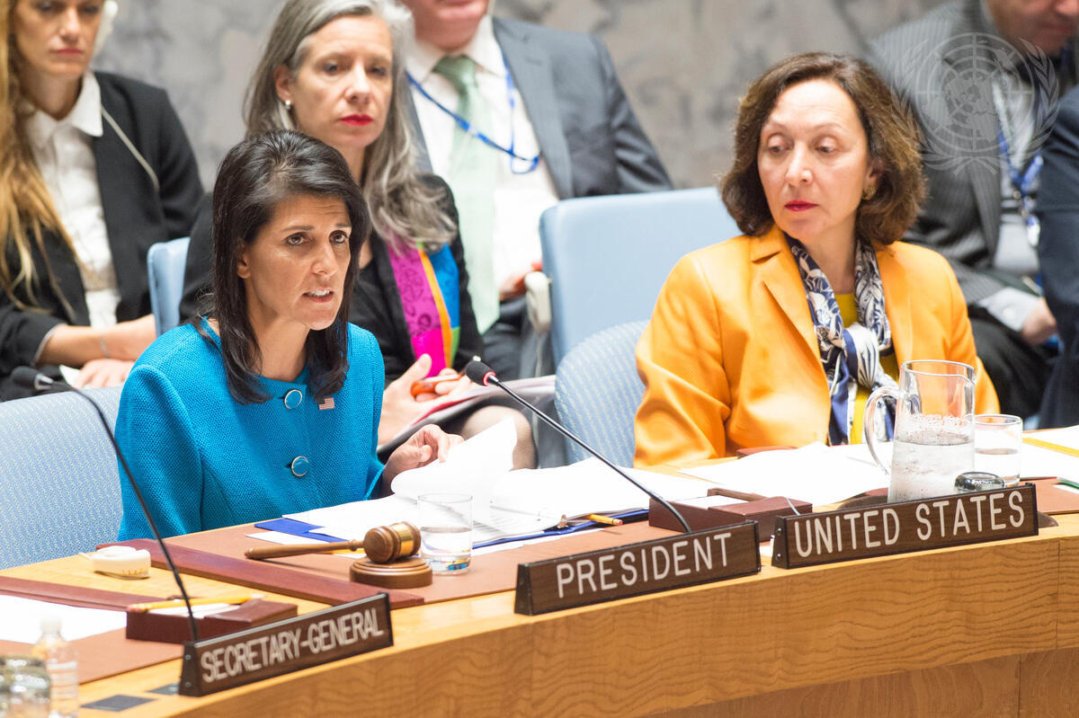 Nikki Haley (left), United States Permanent Representative to the UN and President of the Security Council for April, addresses the Council's meeting on the situation in the Middle East, including the Palestinian question. At her side is Hasmik Egian, Director of the Security Council Affairs Division, Department of Political Affairs.