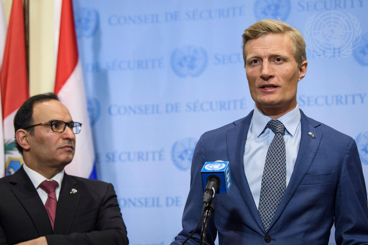 Mansour Al-Otaibi (left), Permanent Representative of the State of Kuwait to the UN, and Carl Orrenius Skau, Security Council Coordinator of Sweden to the UN, speaks to journalists on the situation in Syria and Security Council Resolution 2401.