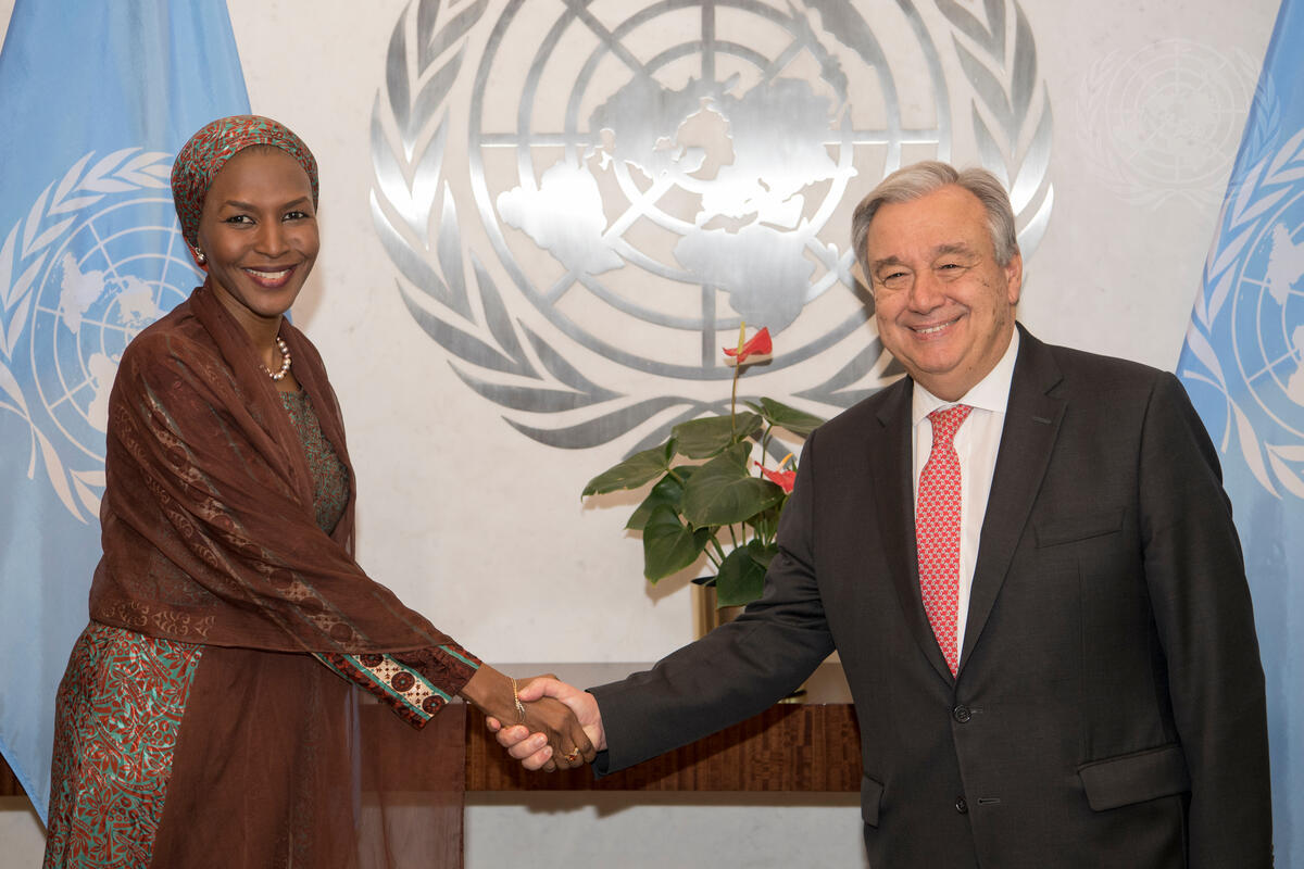 Fatima Kyari Mohammed (left), new Permanent Observer of the African Union, presents her credentials to Secretary-General António Guterres.