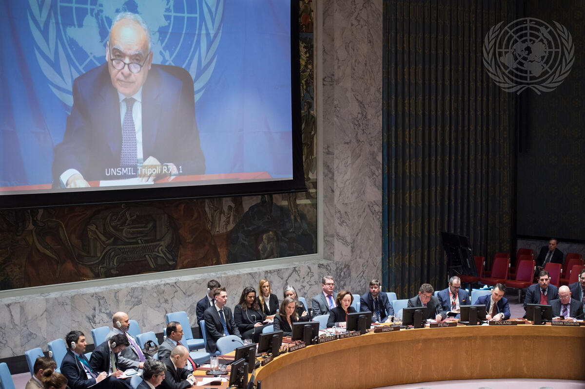 Ghassan Salamé (on screen), Special Representative and Head of the United Nations Support Mission in Libya (UNSMIL) addresses the Security Council.