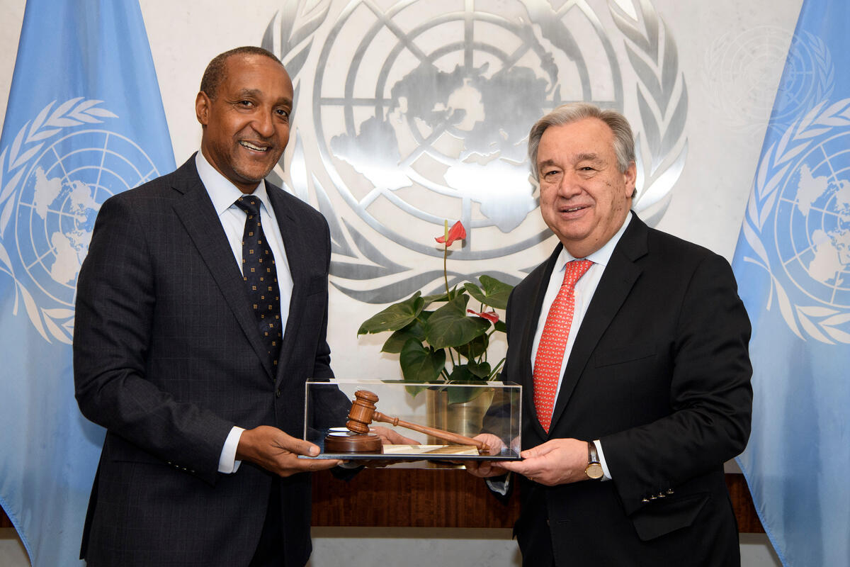 Macharia Kamau (left), Permanent Representative of Kenya, presents a gift to Secretary-General António Guterres while paying him a farewell call.