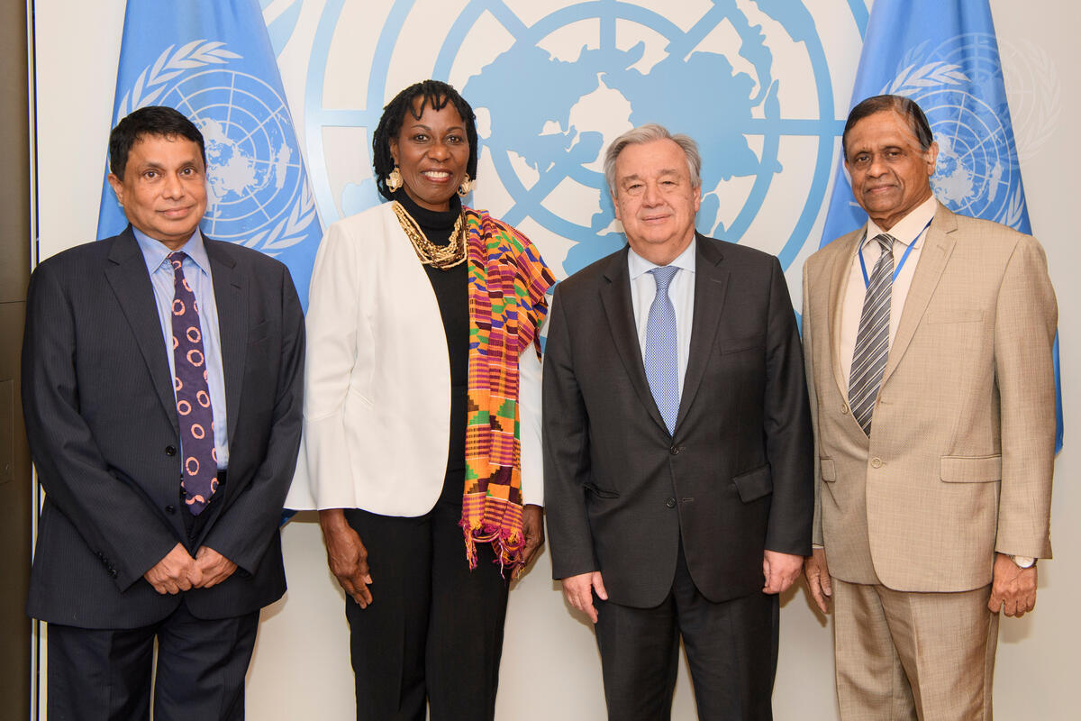 Secretary-General António Guterres (centre right) meets with Graciela Dixon(centre left), former Chief Justice of the Supreme Court of Panama; Amrith Rohan Perera (right), Vice President of the General Assembly; and Ramu Damodaran, Officer-in-Charge of the Department of Public Information.