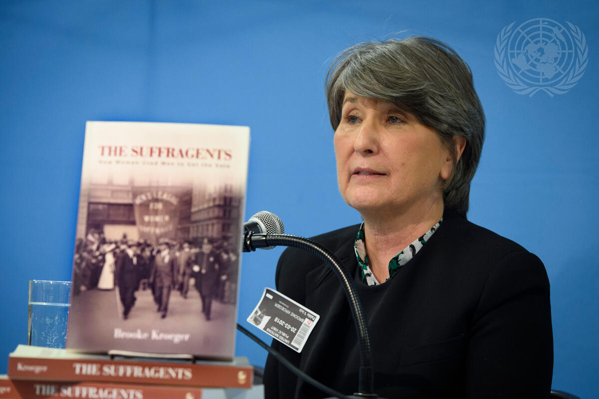 Brooke Kroeger, author of ""The Suffragents: How Women Used Men to Get the Vote,"" signs copies of her book at the UN Bookshop on the occasion of the 62nd session of the Commission on the Status of Women.