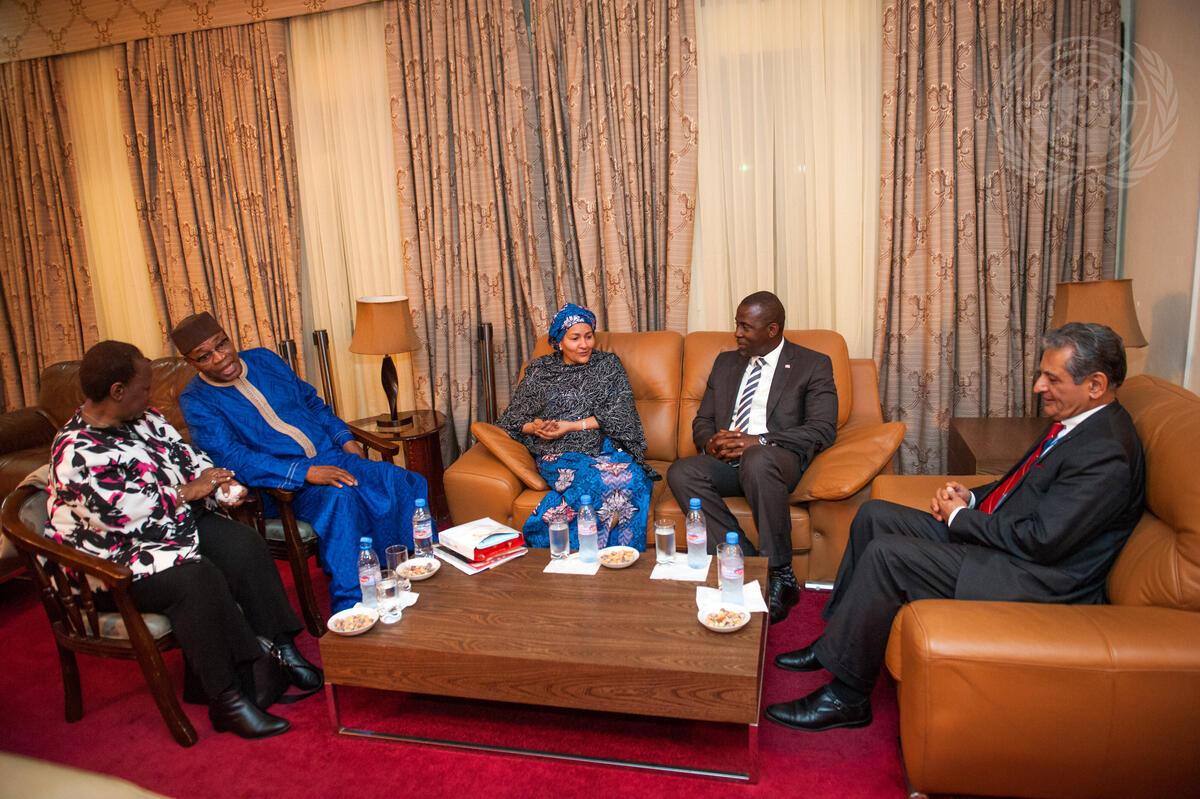 (Left to right) the Assistant Secretary-General for Peacekeeping Operations, Bintou Keita, the Special Representative and Head of the United Nations Office for West Africa and the Sahel (UNOWAS), the United Nations Deputy Secretary General, Amina J. Mohammed,, the acting Minister of Foreign Affair of Liberia, Elias B. Shoniyi, and the Special Representative of the Secretary-General and Head of UNMIL, Farid Zarif, meet at the Roberts International Airport in Harbel, Liberia.