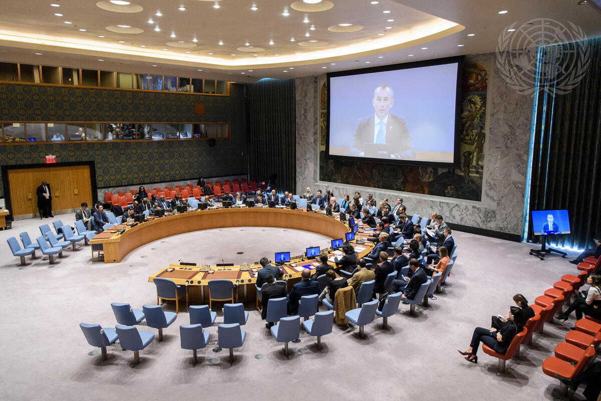 Nickolay Mladenov (on screens), UN Special Coordinator for the Middle East Peace Process and Personal Representative of the Secretary-General to the Palestine Liberation Organization and the Palestinian Authority, briefs the Security Council meeting on the situation in the Middle East, including the Palestinian question.