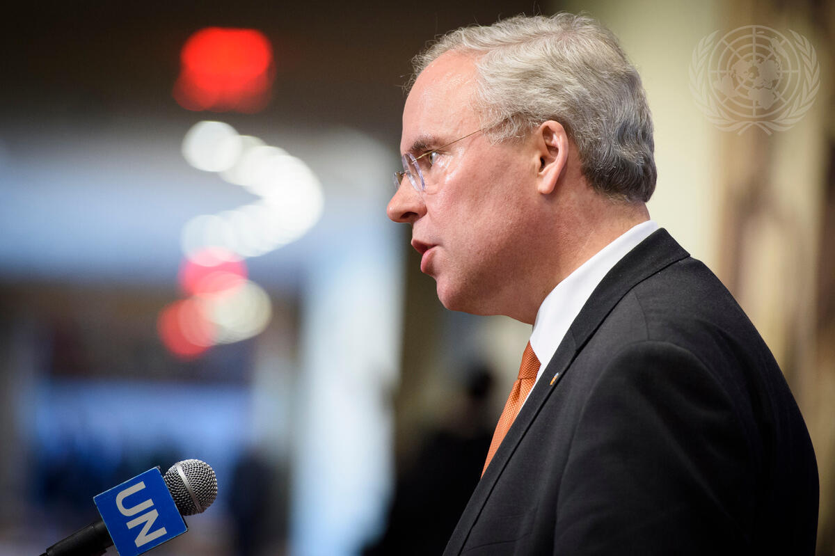 Karel van Oosterom, Permanent Representative of the Netherlands to the United Nations and President of the Security Council for the month of March, reads a statement to press after closed Security Council consultations on The United Nations Disengagement Observer Force (UNDOF).