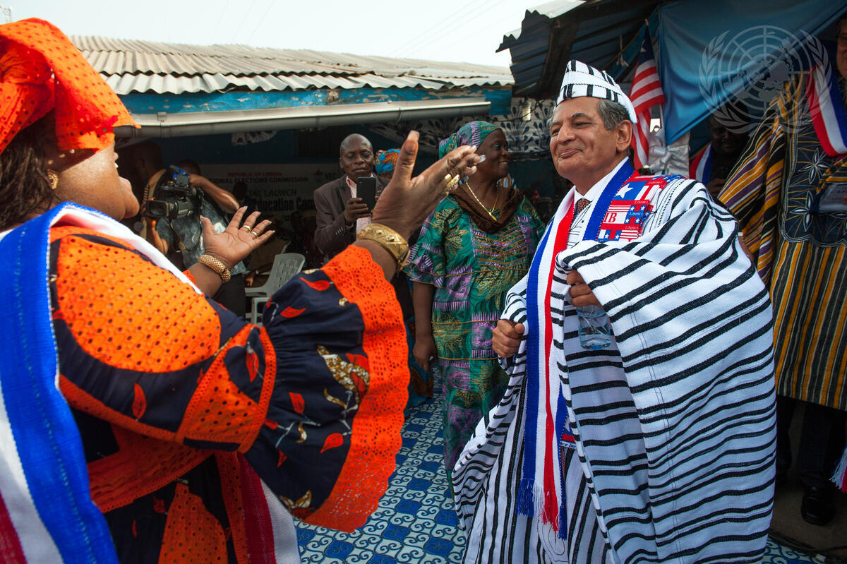 Farid Zarif, Special Representative of the Secretary-General and Head of the United Nations Mission in Liberia (UNMIL), dances during a farewell for the peacekeeping Mission organized by the NGO Liberia Crusaders for Peace in Monrovia. The ceremony brought together stakeholders, including traditional and religious leaders, women and youth groups, to say “Thank You” to UNMIL for establishing peace and security in Liberia. The ceremony included musical and cultural performances and messages expressing gratitude.