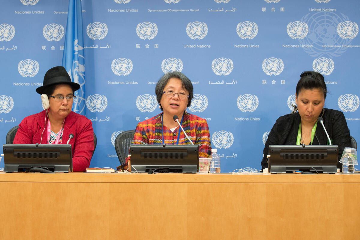 Vicky Tauli-Corpuz (centre), Special Rapporteur on the rights of indigenous peoples, addresses a press briefing on Indigenous Human Rights Defenders. Also briefing journalists with her were Lourdes Tibán Guala (Ecuador) (left), member of the UN Permanent Forum on Indigenous Issues; and Heather Milton-Lightening, Co-Director of the Indigenous Tar Sands Campaign, Polaris Institute in Ottowa, Canada.