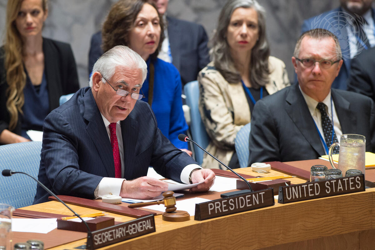 Rex W. Tillerson (front left), United States Secretary of State and President of the Security Council for April, addresses the Security Council ministerial-level meeting on the nuclear weapon and ballistic missile programmes of the Democratic People’s Republic of Korea (DPRK). At right is Jeffrey Feltman, Under-Secretary-General for Political Affairs.