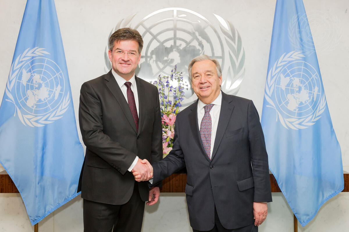 Secretary-General António Guterres (right) meets with Miroslav Lajcák, Minister for Foreign and European Affairs of the Slovak Republic.