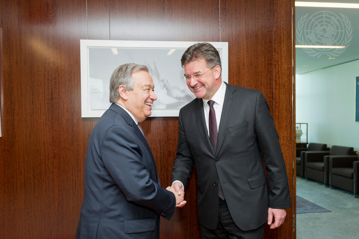 Secretary-General António Guterres (left) meets with Miroslav Lajcák, Minister for Foreign and European Affairs of the Slovak Republic.