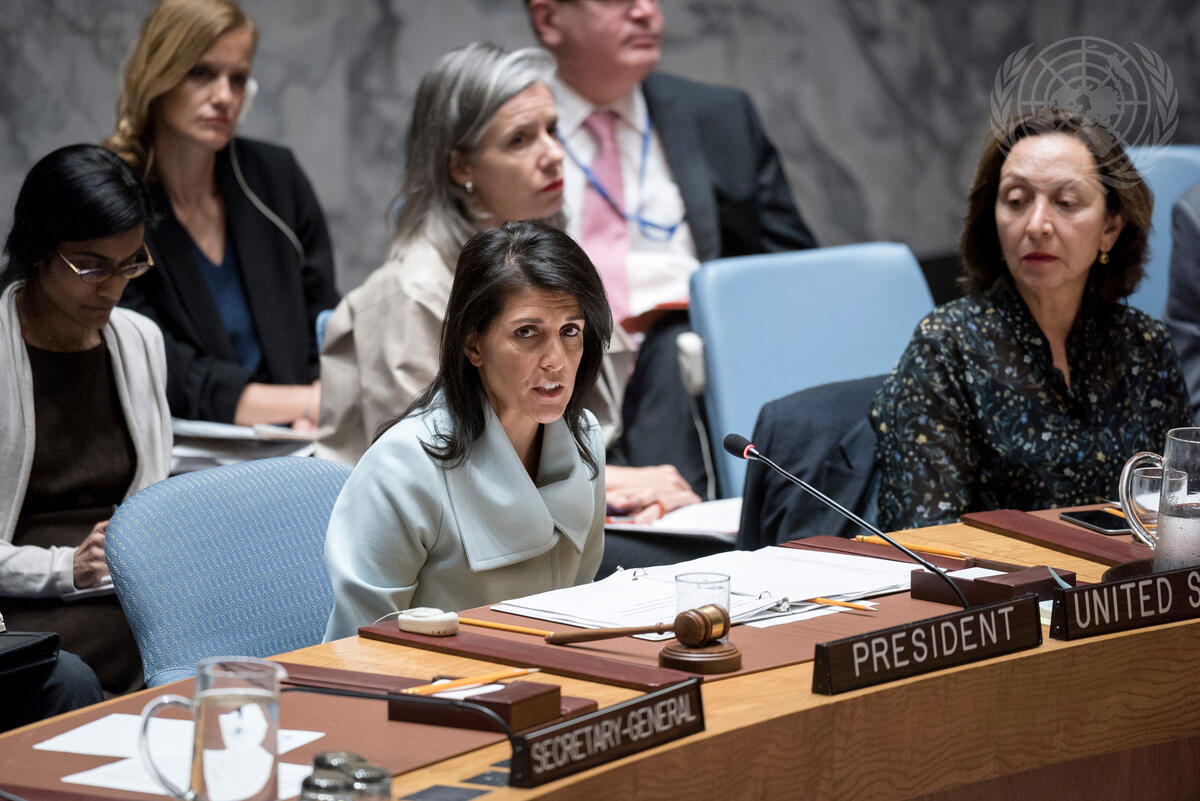Nikki Haley (front left), United States Permanent Representative to the UN and President of the Security Council for April, addresses the Council's meeting on the situation in South Sudan. At her side is Hasmik Egian, Director of the Security Council Affairs Division, Department of Political Affairs.