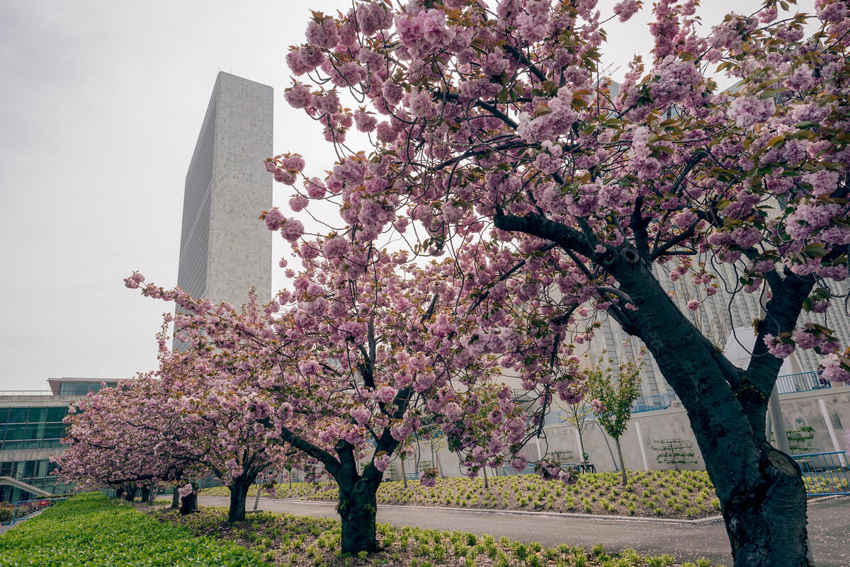 Cherry blossoms at United Nations headquarters in New York, with a backdrop of the Secretariat Building.