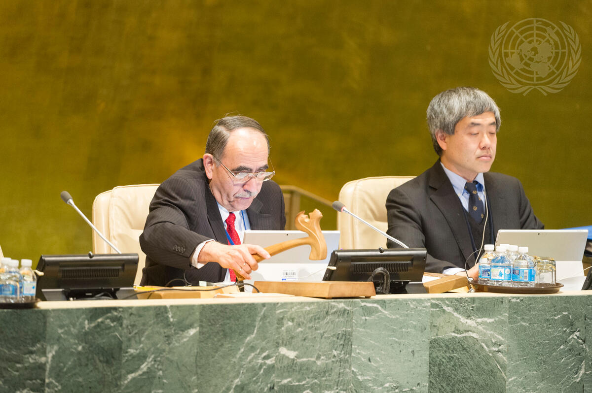 Rubén Ignacio Zamora Rivas (left), Permanent Representative of El Salvador to the UN and Vice-President of General Assembly, chairs the Assembly’s meeting on cooperation between the United Nations and regional and other organizations. The Assembly also considered the appointment of members of the Independent Audit Advisory Committee, and members of the Joint Inspection Unit. Also pictured, Kenji Nakano, Chief of the General Assembly Affairs Branch, Department for General Assembly and Conference Management (DGACM).