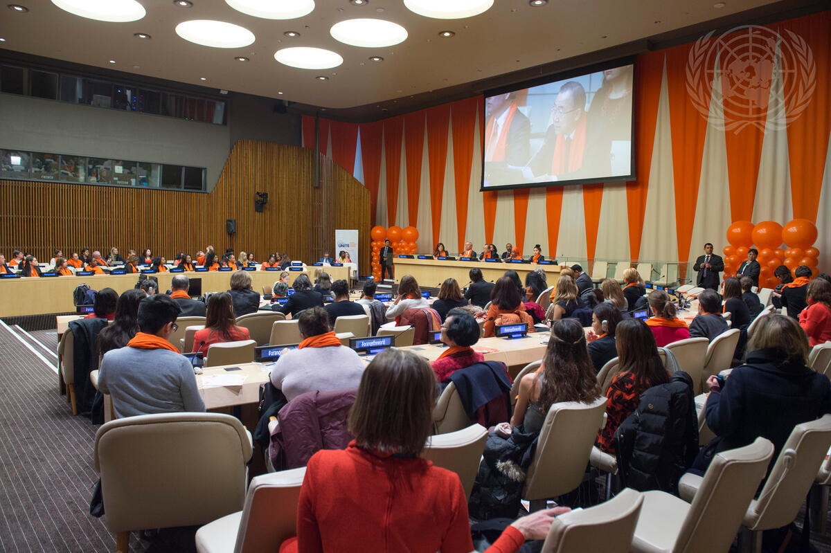 Secretary-General Ban Ki-moon (seen on screen) speaks at the United Nations Official Commemoration of the International Day for the Elimination of Violence against Women: “Orange the World: Raise Money to end Violence against Women”.