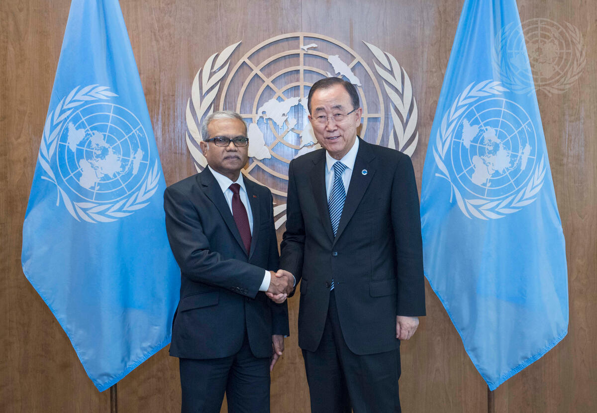 Secretary-General Ban Ki-moon (right) meets with Mohamed Asim, Minister for Foreign Affairs of the Republic of Maldives.