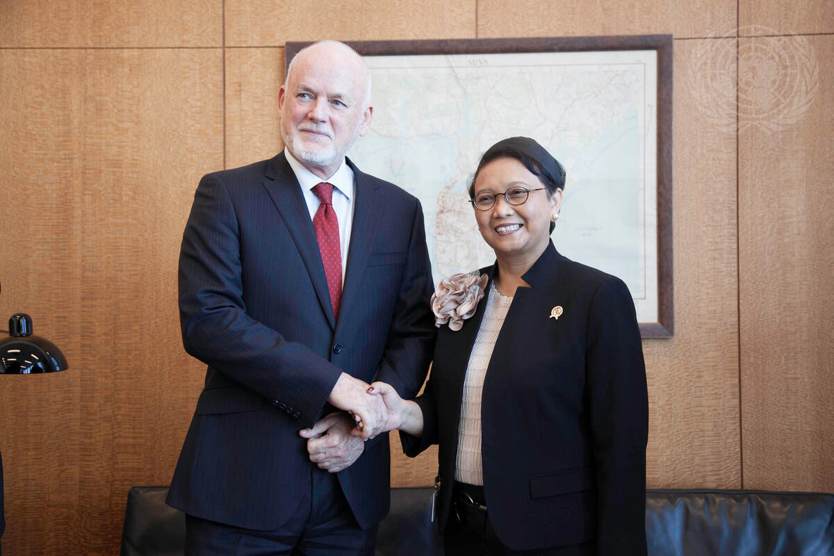 Peter Thomson (left), President of the seventy-first session of the General Assembly meets with Retno Lestari Priansari Marsudi, Minister for Foreign Affairs of the Republic of Indonesia.