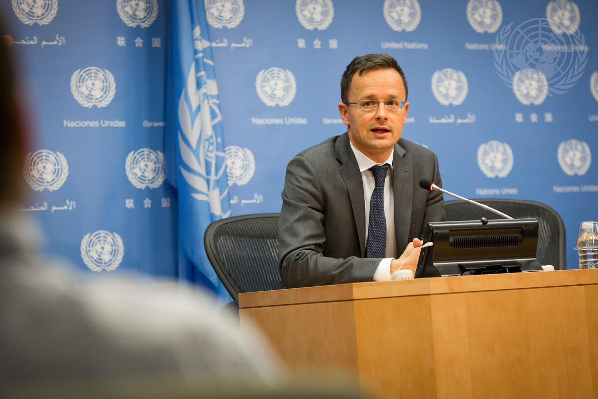Péter Szijjártó, Minister for Foreign Affairs and Trade of Hungary, addresses a press conference on the margins of the General Assembly general debate.