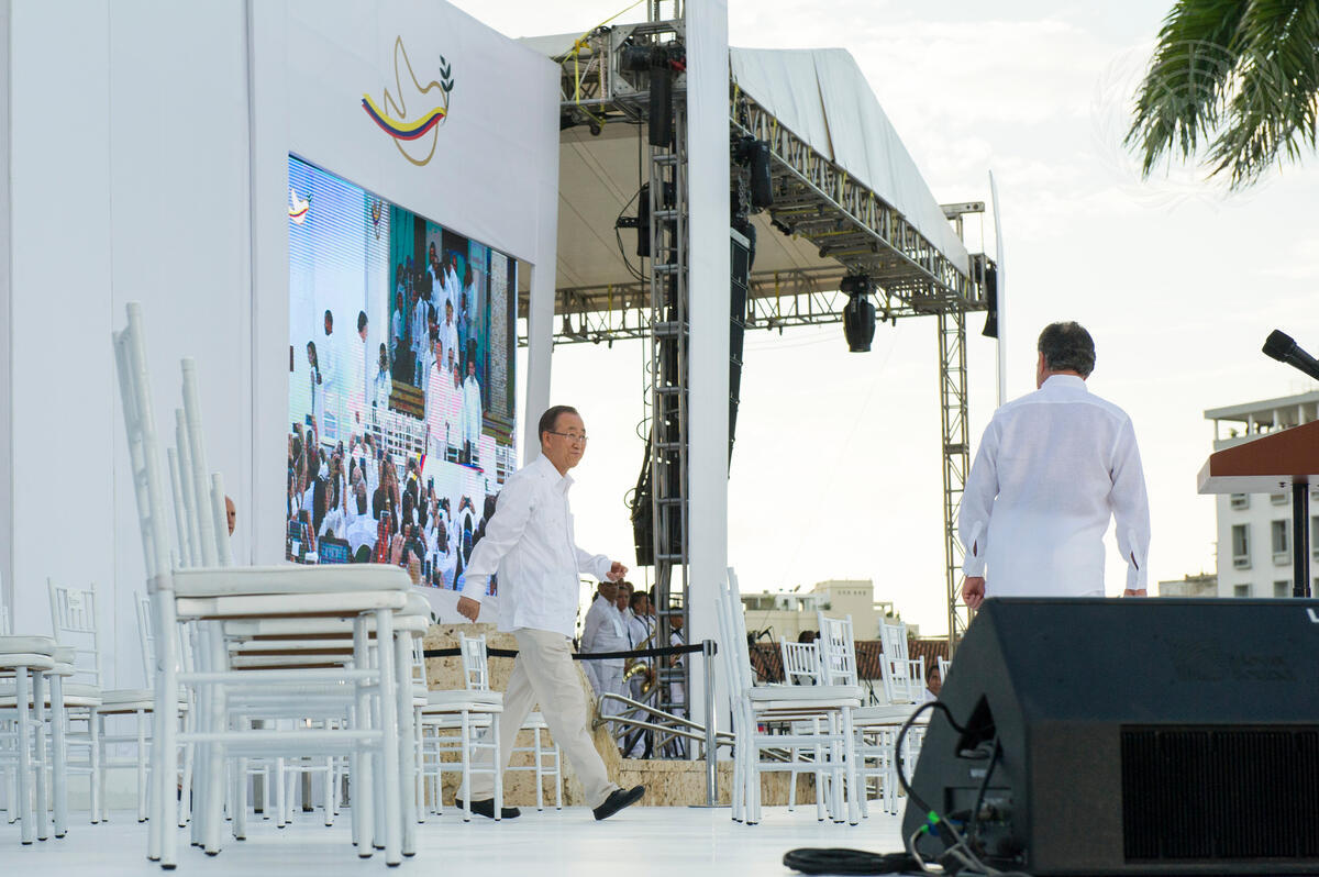 Secretary-General Ban Ki-moon (left) comes on stage to address the signing ceremony of the Colombian Peace Agreement, in Cartegena. At right is Juan Manuel Santos Calderón (centre right), President of Colombia.