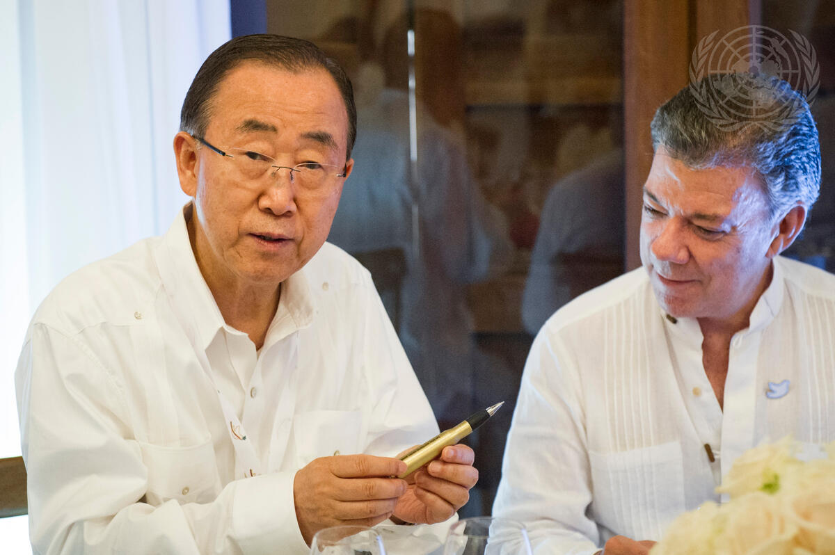 Secretary-General Ban Ki-moon (left), receives from Juan Manuel Santos Calderón, President of Colombia, a pen similar to the ones used to sign the Colombian Peace Agreement. The pens are made from recycled bullets and have inscriptions that read: ""Bullets wrote our past. Education, our future.""