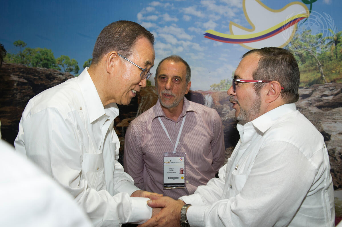 Secretary-General Ban Ki-moon (left), meets with Timoleon Jimenez, “Timochenko"" (right), Commander of the Revolutionary Armed Forces of Colombia--People's Army (FARC-EP), during the signing ceremony fo the Colombian Peace Agreement, in Cartagena.
