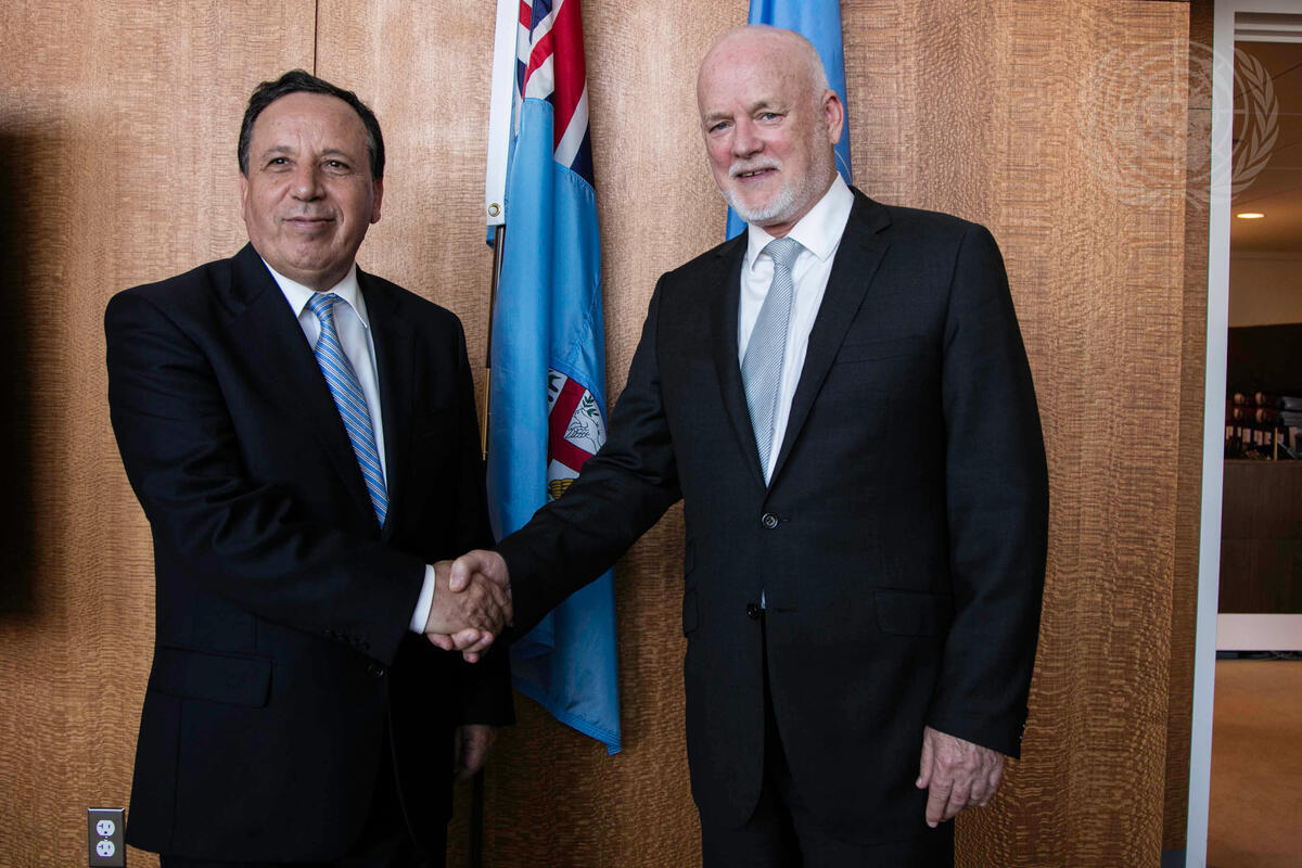 Peter Thomson (right), President of the General Assembly's seventy-first session, meets with Khemais Jhinaoui, Minister for Foreign Affairs Republic of Tunisia.