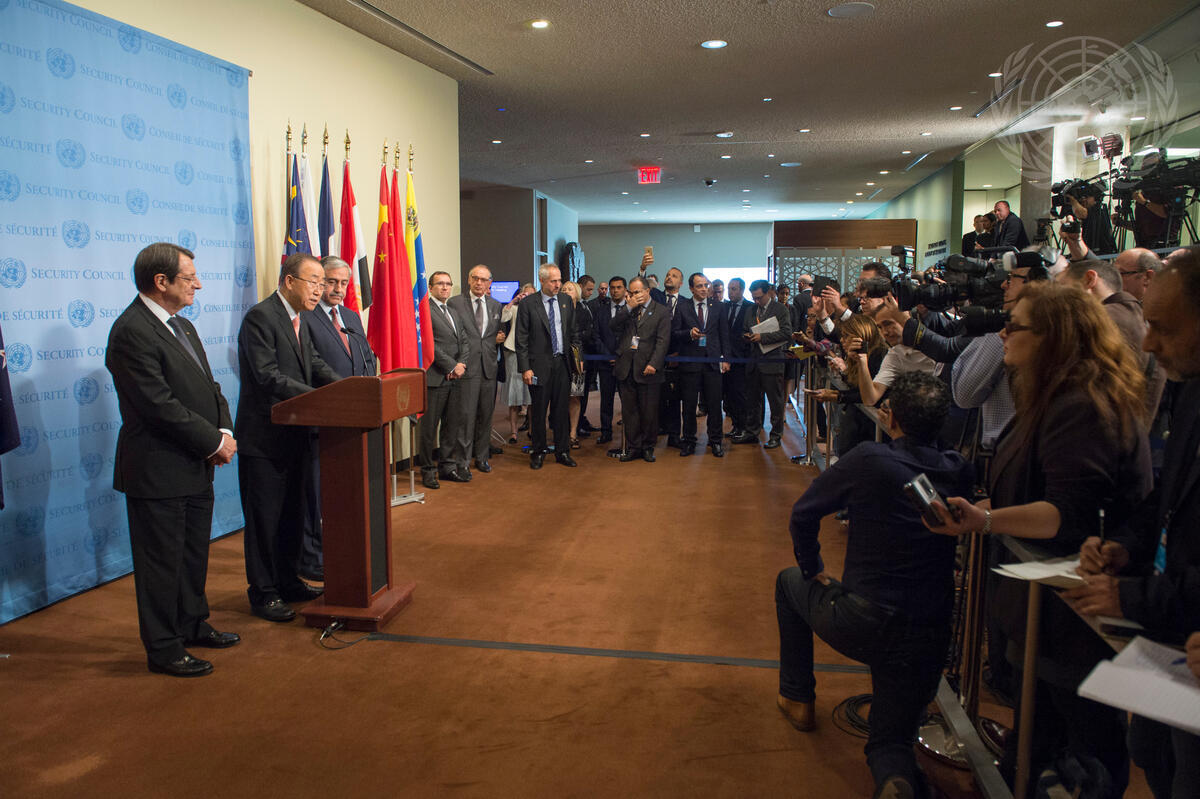 Secretary-General Ban Ki-moon (podium) briefs journalists following his meeting with Nicos Anastasiades (left), President of the Republic of Cyprus, and Mustafa Akinci (right), Leader of the Turkish Cypriot Community.