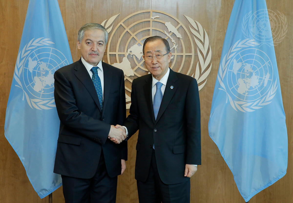 Secretary-General Ban Ki-moon (right) meets with Sirodjidin Aslov, Minister for Foreign Affairs of the Republic of Tajikistan.
