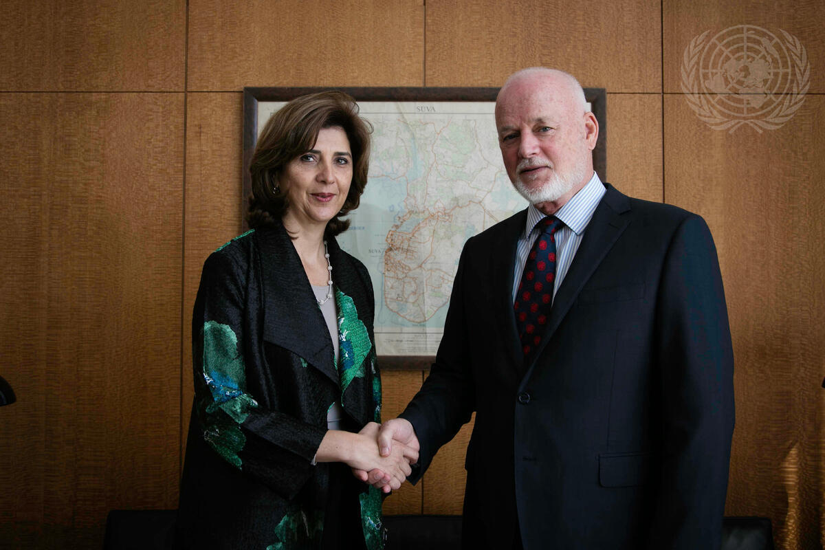 Peter Thomson (right), President of the seventy-first session of the General Assembly, meets with María Ángela Holguín Cuéllar, Minister for Foreign Affairs of Colombia.