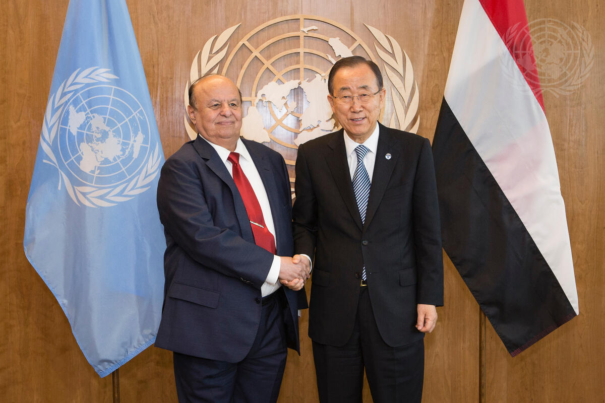 Secretary-General Ban Ki-moon (right) meets with Abdrabuh Mansour Hadi Mansour, President of the Republic of Yemen.
