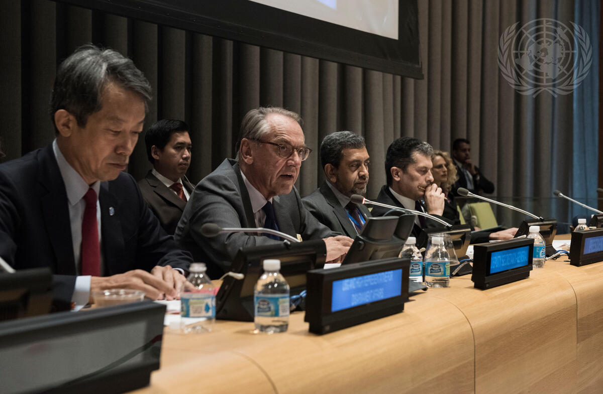Deputy Secretary-General Jan Eliasson (second from left on dais) addresses the General Assembly high-level informal plenary meeting to commemorate and promote the International Day for the Total Elimination of Nuclear Weapons (26 September). Also pictured (from left): Kim Won-soo, UN High Representative for Disarmament Affairs; Durga Prasad Bhattarai, Permanent Representative of the Federal Democratic Republic of Nepal to the UN and Acting President of the General Assembly; Movses Abelian, Assistant Secretary-General for General Assembly and Conference Management.