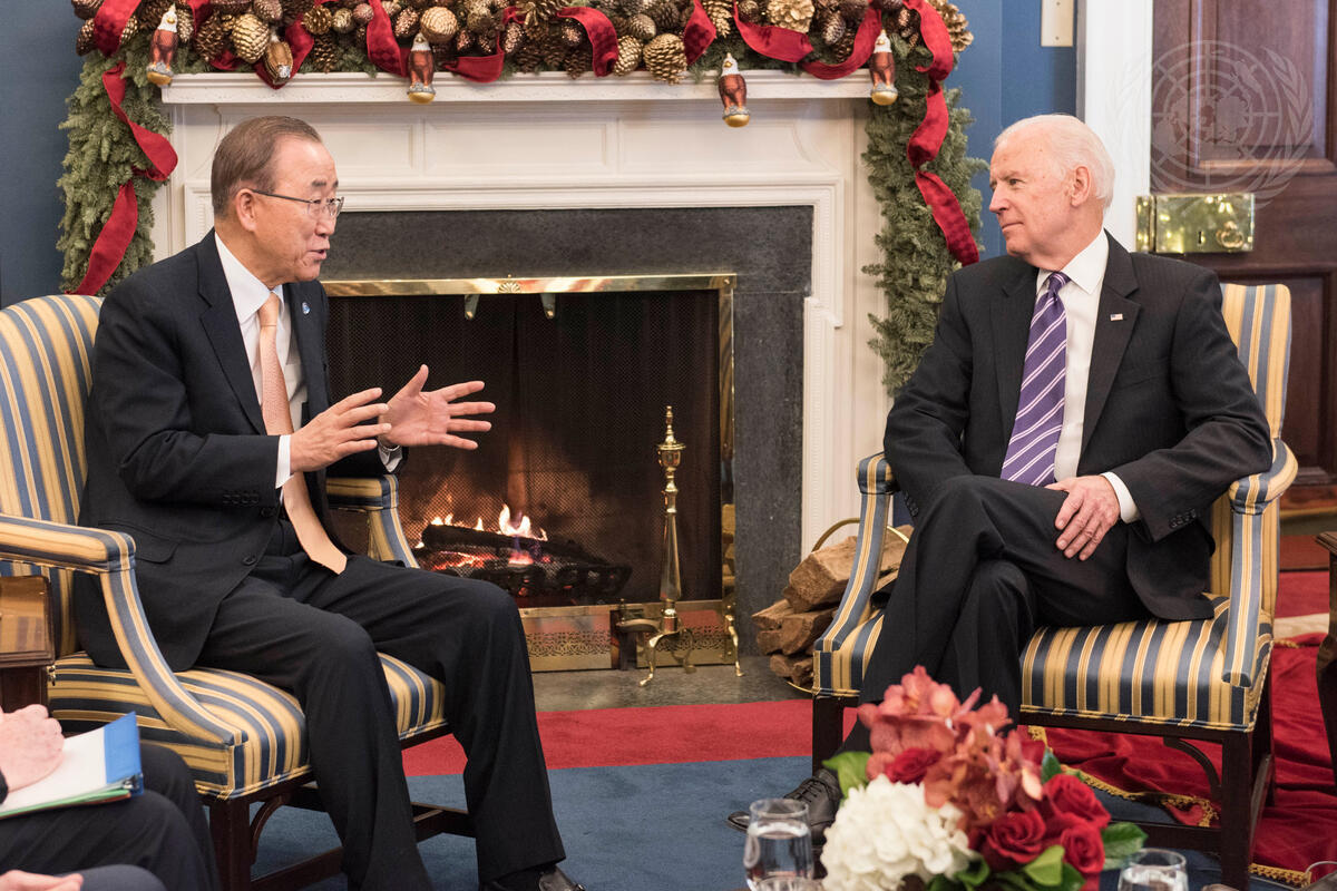 Secretary-General Ban Ki-moon (left) meets with Joe Biden, Vice President of the United States, in Washington, D.C.