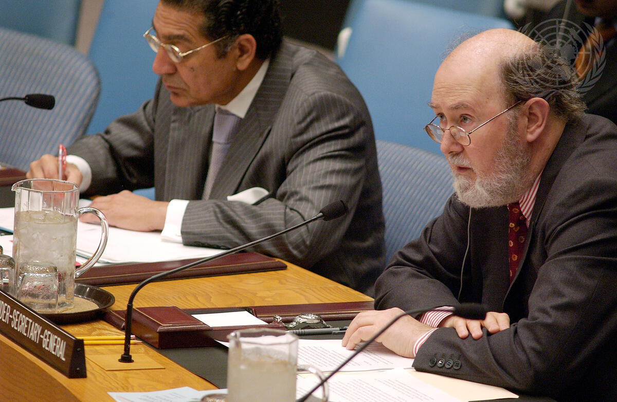 "Under-Secretary-General Kieran Prendergast (right), Department of Political Affairs, addresses the Security Council as it discusses the situation in the Middle East, including the Palestinian question.