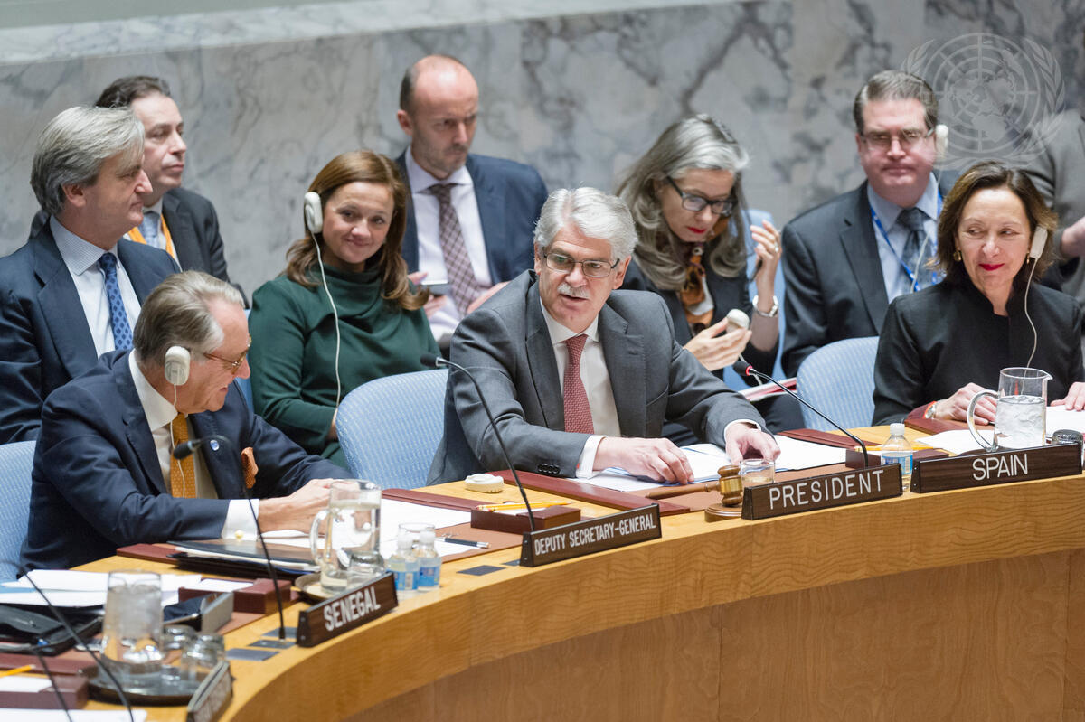 Alfonso Dastis (front centre), Minister for Foreign Affairs and Cooperation of Spain and President of the Security Council for December, chairs the Council’s high-level open debate on the theme “Preventing catastrophe: a global agenda for stopping the proliferation of weapons of mass destruction [WMDs] by non-State actors”. He is flanked by Deputy Secretary-General Jan Eliasson (left) and Hasmik Egian, Director of the Security Council Affairs Division, Department of Political Affairs.
