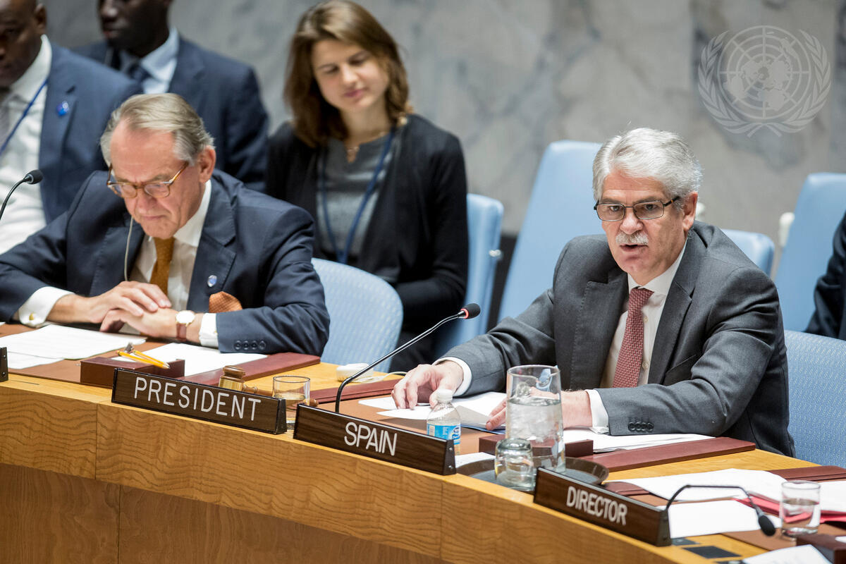 Alfonso Dastis (right), Minister for Foreign Affairs and Cooperation of Spain and President of the Security Council for December, addresses the Council’s high-level open debate on the theme “Preventing catastrophe: a global agenda for stopping the proliferation of weapons of mass destruction [WMDs] by non-State actors”. At his side is Deputy Secretary-General Jan Eliasson.