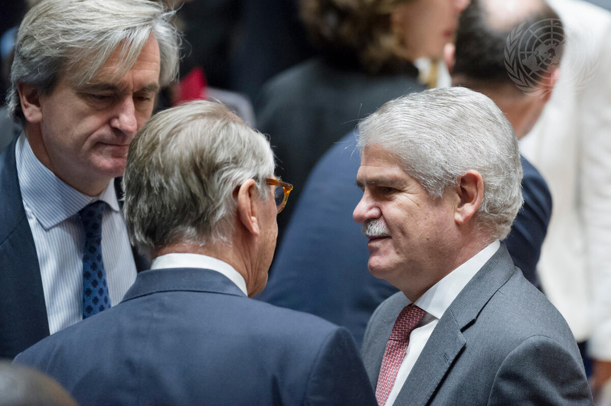 Alfonso Dastis (right), Minister for Foreign Affairs and Cooperation of Spain and President of the Security Council for December, at the debate with Deputy Secretary-General Jan Eliasson (back to camera) and Román Oyarzun Marchesi, Permanent Representative of Spain to the UN.